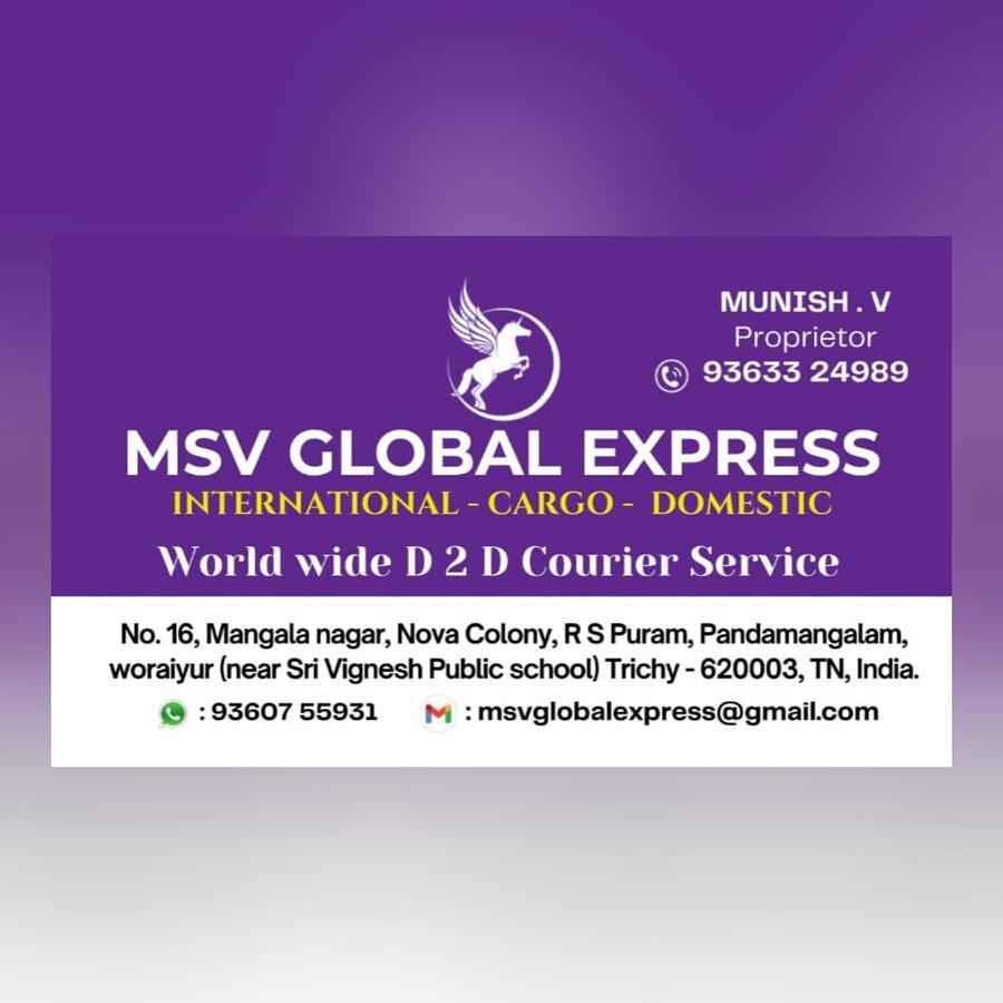 Your Trusted Partner in International ShippingAt MSV Global Express, we're a team of passionate logistics professionals dedicated to streamlining your international courier, cargo, and domestic shipping needs. Established in Trichy, India, we combine local expertise with a global network to provide seamless and efficient shipping solutions for businesses and individuals.